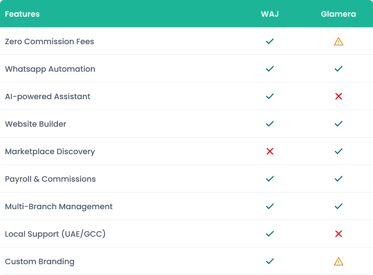 بينما غلاميرا أداة وظيفية مع فوائد السوق الإلكتروني، وَجْ منصة ذكية مبنية للنمو مع علامتك التجارية. وَجْ يقدم ملكية كاملة لعلاقات عملائك، وأتمتة مدعومة بالذكاء الاصطناعي وتخصيص الحجوزات، وبدون عمولات أو تشتيت من السوق الإلكتروني، وواتساب مدمج، ومخزون، وإدارة علاقات العملاء، وكشوف مرتبات، والمزيد.