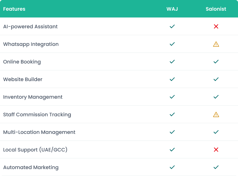 بينما يوفر Salonist حلول حجز مرنة، وَجْ يذهب أبعد من ذلك بكثير—مع الأتمتة والذكاء الاصطناعي والأدوات المالية وملكية العملاء وميزات التسويق المدمجة التي تلغي التكاليف الإضافية والإعداد والقيود.