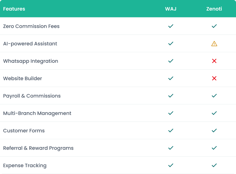 إليك تفصيل لكيفية مقارنة وَجْ مع زينوتي - ولماذا قد يكون وَجْ الخيار الأفضل للصالونات الحديثة سريعة التوسع التي تبحث عن ميزات قوية بدون تعقيد على مستوى المؤسسات.