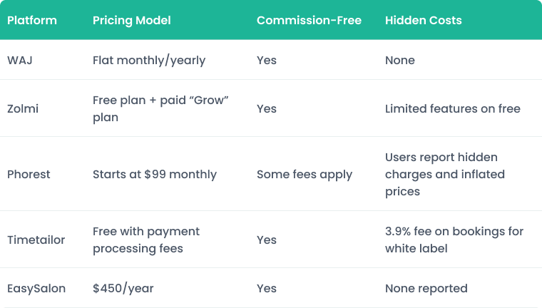 اليوم، نحن نحلل كيف يقارن وَجْ مع أربعة خيارات شائعة لبرامج الصالونات: زولمي فيروست، تايمتايلور، و وإيزيسالون. لا حشو، لا مصطلحات محيرة—فقط حديث حقيقي حول ما تقدمه كل منصة فعلاً.
