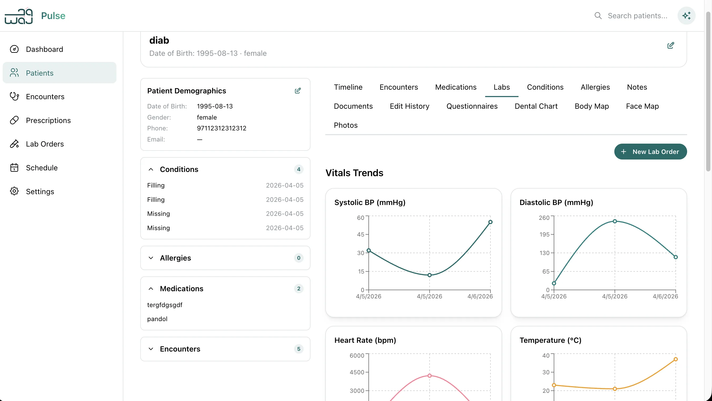 Complete patient profile with demographics, vital signs tracking, allergy management, medical history, medications, lab results, conditions, and documents — all in one view, updated in real time.
